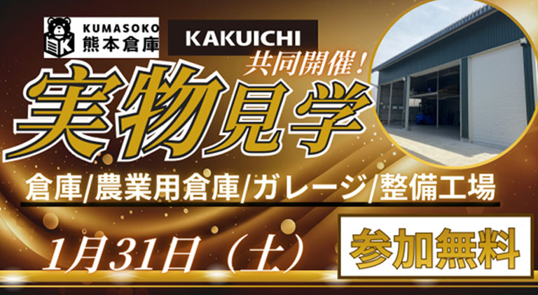 当社の倉庫・ガレージ専門建築事業「熊本倉庫(KUMASOKO)」では、高品質とコストパフォーマンスで人気のメーカー「カクイチ」様と共同で、最新の倉庫・ガレージを“見て・触れて・体感”できる【実物見学会】を開催致します。
